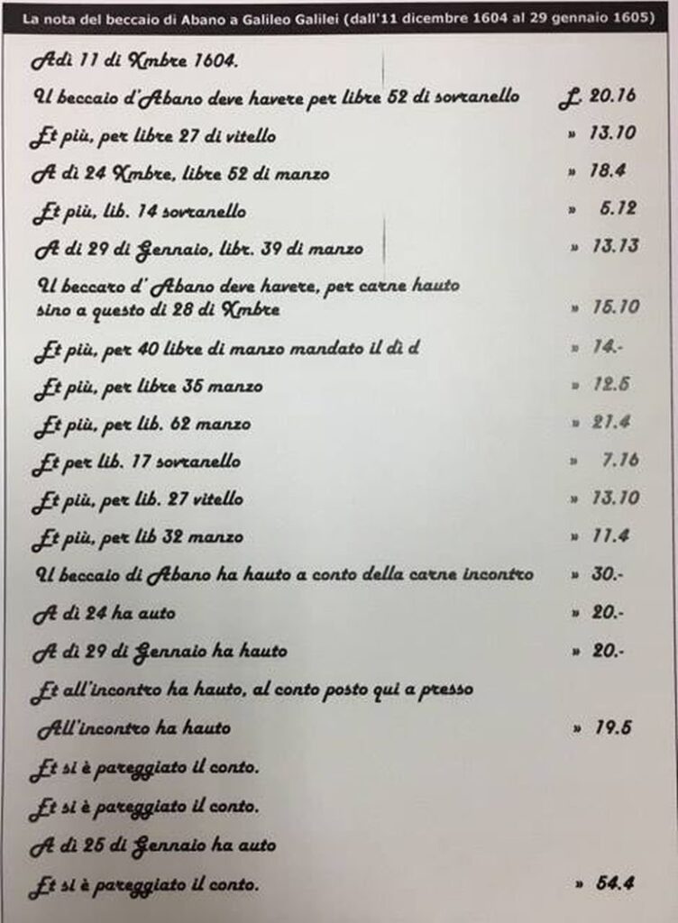 A provare questa sua predilezione, è una lista della spesa vergata l’11 dicembre 1604 proprio dal celebre astronomo. Si tratta di una nota delle spese di carne ad un “beccaio” (macellaio) di Abano Terme, località vicinissima a Padova.