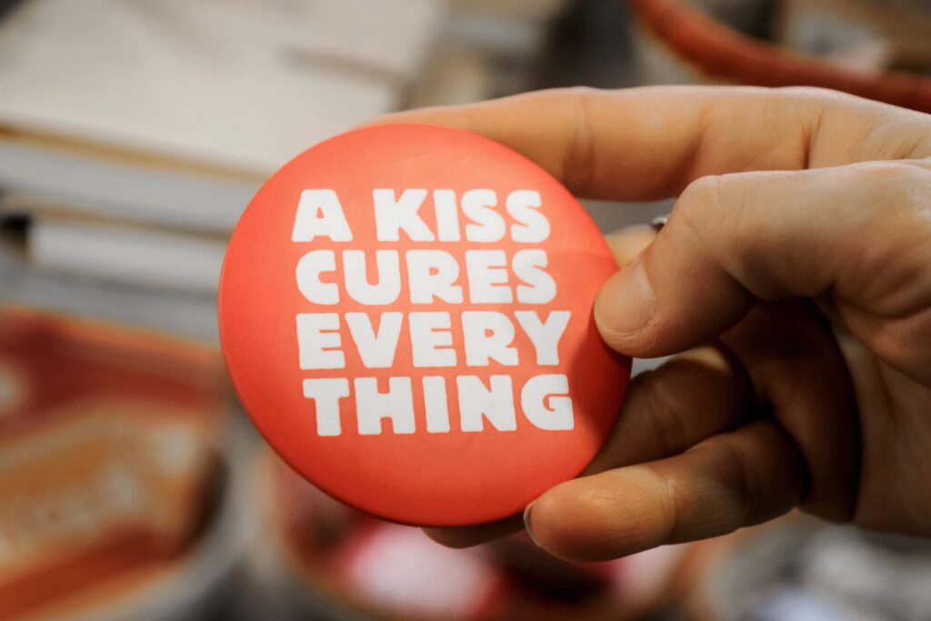 “Obbligatorio baciarsi”, un’indicazione che ha la forma e le sembianze di cartelli stradali, quelli blu e rotondi che impongono un obbligo. Ma il suo messaggio, sicuramente inusuale, è molto più di quello che sembra. Perché le sagome di due persone che si stringono in un bacio sono eloquenti: davanti a questo cartello ci si deve baciare.