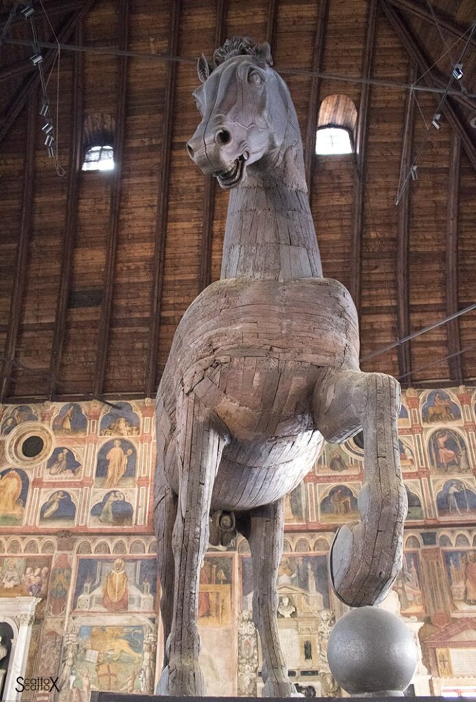 Entrando nel Palazzo della Ragione, infatti, non potrete non vedere un gigantesco cavallo ligneo. Si tratta della copia rinascimentale di quello del monumento al Gattamelata di Donatello, collocato di fronte alla Basilica di Sant’Antonio da Padova.