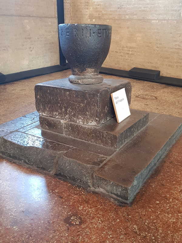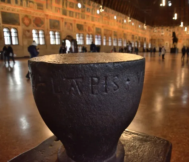 A destra dell’ingresso del piano superiore di Palazzo della Ragione vedrete un blocco di porfido nero: è la pietra del vituperio. Un oggetto particolare, che ha una storia da conoscere.